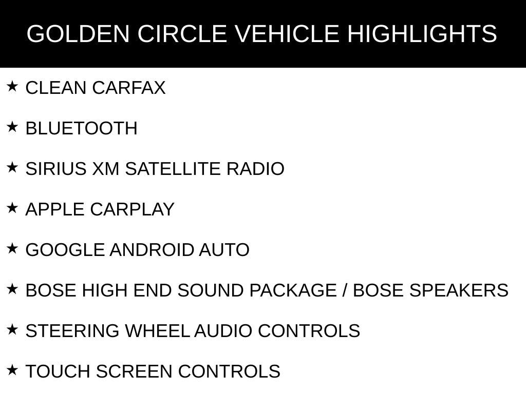 CLEAN CARFAX, BLUETOOTH, SIRIUS XM SATELLITE RADIO, APPLE CARPLAY, GOOGLE ANDROID AUTO, BOSE HIGH END SOUND PACKAGE / BOSE SPEAKERS, STEERING WHEEL AUDIO CONTROLS, TOUCH SCREEN CONTROLS, BACKUP CAMERA, HOMELINK UNIVERSAL GARAGE DOOR OPENER, KEYLESS PUSH BUTTON START, POWER DRIVER SEAT, POWER PASSENGER SEAT, HEATED FRONT LEATHER SEATS, PANORAMIC SUNROOF/MOONROOF, MEMORY PACKAGE / MEMORY SEAT, REMOTE START, POWER LIFTGATE, HEATED STEERING WHEEL, LUXURY SERIES, PREFERRED EQUIPMENT PACKAGE 1SC, 18 BRIGHT MACHINED FINISH ALUMINUM WHEELS, 8 SPEAKERS, AIR CONDITIONING, AUTO-DIMMING DOOR MIRRORS, AUTO-DIMMING REAR-VIEW MIRROR, AUTOMATIC DUAL-ZONE CLIMATE CONTROL, AUTOMATIC TEMPERATURE CONTROL, BRAKE ASSIST, CHILD-SEAT-SENSING AIRBAG, DELAY-OFF HEADLIGHTS, EMERGENCY COMMUNICATION SYSTEM: ONSTAR DIRECTIONS & CONNECTIONS, FOUR WHEEL INDEPENDENT SUSPENSION, FRONT DUAL ZONE A/C, GENUINE WOOD DOOR PANEL INSERT, HEATED DOOR MIRRORS, LOW TIRE PRESSURE WARNING, OCCUPANT SENSING AIRBAG, OUTSIDE TEMPERATURE DISPLAY, OVERHEAD CONSOLE, PANIC ALARM, PASSENGER VANITY MIRROR, POWER DOOR MIRRORS, POWER WINDOWS, PREMIUM AUDIO SYSTEM: CADILLAC CUE, RAIN SENSING WIPERS, REAR WINDOW DEFROSTER, REAR WINDOW WIPER, REMOTE KEYLESS ENTRY, ROOF RACK: RAILS ONLY, SPEED CONTROL, SPEED-SENSING STEERING, STEERING WHEEL MEMORY, TELESCOPING STEERING WHEEL, TILT STEERING WHEEL, VARIABLY INTERMITTENT WIPERS.