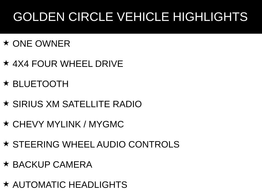 ONE OWNER, 4X4 FOUR WHEEL DRIVE, BLUETOOTH, SIRIUS XM SATELLITE RADIO, CHEVY MYLINK / MYGMC, STEERING WHEEL AUDIO CONTROLS, BACKUP CAMERA, AUTOMATIC HEADLIGHTS, DROP-IN BEDLINER, TOW PACKAGE / TRAILER PACKAGE, RUNNING BOARDS, ALL WEATHER FLOOR MATS, LT SERIES, PREFERRED EQUIPMENT PACKAGE 2LT, TRAILERING PACKAGE, 18" BRIGHT MACHINED ALUMINUM WHEELS, 3.42 REAR AXLE RATIO, 40/20/40 FRONT SPLIT BENCH SEAT, 6 SPEAKER AUDIO SYSTEM, AIR CONDITIONING, BODY COLOR BODYSIDE MOLDINGS, BODY COLOR REAR BUMPER W/CORNERSTEPS, BODY-COLOR DOOR HANDLES, BODY-COLOR GRILLE SURROUND, BRAKE ASSIST, COMPASS, DEEP-TINTED GLASS, DELAY-OFF HEADLIGHTS, DRIVER VANITY MIRROR, EMERGENCY COMMUNICATION SYSTEM: ONSTAR GUIDANCE, EZ LIFT & LOWER TAILGATE, FRONT BODY-COLOR BUMPER, FRONT CHROME BUMPER, HEATED DOOR MIRRORS, HIGH-INTENSITY DISCHARGE HEADLIGHTS, LOW TIRE PRESSURE WARNING, MANUAL TILT WHEEL STEERING COLUMN, OCCUPANT SENSING AIRBAG, OUTSIDE TEMPERATURE DISPLAY, OVERHEAD CONSOLE, PASSENGER VANITY MIRROR, POWER DOOR MIRRORS, POWER WINDOWS W/DRIVER EXPRESS UP, PREMIUM AUDIO SYSTEM: CHEVROLET MYLINK, REAR 60/40 FOLDING BENCH SEAT (FOLDS UP), REAR STEP BUMPER, REAR VISION CAMERA, REMOTE KEYLESS ENTRY, REMOTE LOCKING TAILGATE, SPEED CONTROL, SPEED-SENSING STEERING, TILT STEERING WHEEL, VARIABLY INTERMITTENT WIPERS.