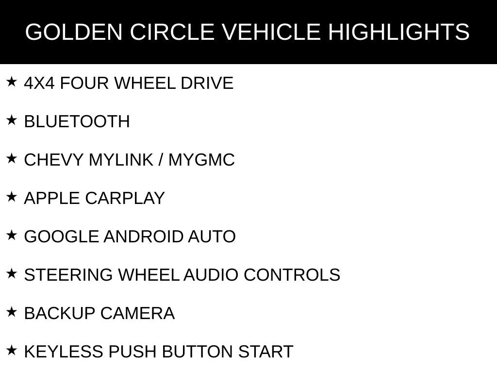 4X4 FOUR WHEEL DRIVE, BLUETOOTH, CHEVY MYLINK / MYGMC, APPLE CARPLAY, GOOGLE ANDROID AUTO, STEERING WHEEL AUDIO CONTROLS, BACKUP CAMERA, KEYLESS PUSH BUTTON START, POWER DRIVER SEAT, HEATED FRONT CLOTH SEATS, REMOTE START, HEATED STEERING WHEEL, TOW PACKAGE / TRAILER PACKAGE, WEATHERTECH ALL WEATHER FLOOR MATS, LT SERIES, ALL-STAR EDITON, CONVENIENCE PACKAGE, PREFERRED EQUIPMENT PACKAGE 1LT, TRAILERING PACKAGE, 17" BRIGHT SILVER PAINTED ALUMINUM WHEELS, 3.42 REAR AXLE RATIO, 6 SPEAKERS, AIR CONDITIONING, BRAKE ASSIST, CHEVROLET CONNECTED ACCESS, CHEVROLET W/4G LTE, CHROME GRILLE, CHROME MIRROR CAPS, COMPASS, DEEP-TINTED GLASS, DELAY-OFF HEADLIGHTS, DRIVER VANITY MIRROR, DUAL FRONT IMPACT AIRBAGS, DUAL FRONT SIDE IMPACT AIRBAGS, DUAL-ZONE AUTOMATIC CLIMATE CONTROL, ELECTRIC REAR-WINDOW DEFOGGER, ELECTRICAL LOCK CONTROL STEERING COLUMN, EZ LIFT POWER LOCK & RELEASE TAILGATE, FRONT CENTER ARMREST W/STORAGE, FRONT FRAME-MOUNTED BLACK RECOVERY HOOKS, HEATED DOOR MIRRORS, LOCKING TAILGATE, LOW TIRE PRESSURE WARNING, MANUAL TILT/TELESCOPING STEERING COLUMN, ONSTAR & CHEVROLET CONNECTED SERVICES CAPABLE, OUTSIDE TEMPERATURE DISPLAY, OVERHEAD CONSOLE, PANIC ALARM, PASSENGER VANITY MIRROR, POWER DOOR LOCKS, POWER DOOR MIRRORS, POWER WINDOWS, REMOTE KEYLESS ENTRY, SINGLE-ZONE MANUAL/SEMI-AUTOMATIC AIR CONDITIONING, SPEED-SENSING STEERING, TILT STEERING WHEEL, VARIABLY INTERMITTENT WIPERS.