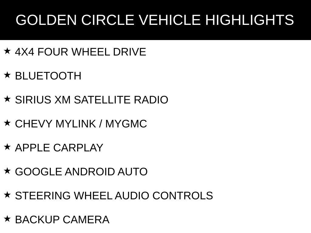 4X4 FOUR WHEEL DRIVE, BLUETOOTH, SIRIUS XM SATELLITE RADIO, CHEVY MYLINK / MYGMC, APPLE CARPLAY, GOOGLE ANDROID AUTO, STEERING WHEEL AUDIO CONTROLS, BACKUP CAMERA, SPRAY-IN BEDLINER, TOW PACKAGE / TRAILER PACKAGE, RUNNING BOARDS, ALL WEATHER FLOOR MATS, LT SERIES, PREFERRED EQUIPMENT PACKAGE 1LT, 17" BRIGHT SILVER PAINTED ALUMINUM WHEELS, 220 AMPS ALTERNATOR, 3.23 REAR AXLE RATIO, 6 SPEAKERS, BRAKE ASSIST, BUMPERS: CHROME, CHROME GRILLE, CHROME MIRROR CAPS, COMPASS, DEEP-TINTED GLASS, DELAY-OFF HEADLIGHTS, DRIVER VANITY MIRROR, DUAL FRONT IMPACT AIRBAGS, DUAL FRONT SIDE IMPACT AIRBAGS, FRONT CENTER ARMREST W/STORAGE, FRONT FRAME-MOUNTED BLACK RECOVERY HOOKS, HEATED DOOR MIRRORS, LOCKING TAILGATE, LOW TIRE PRESSURE WARNING, OCCUPANT SENSING AIRBAG, OUTSIDE TEMPERATURE DISPLAY, OVERHEAD CONSOLE, PASSENGER VANITY MIRROR, POWER DOOR LOCKS, POWER DOOR MIRRORS, POWER FRONT WINDOWS W/PASSENGER EXPRESS DOWN, REMOTE KEYLESS ENTRY, REMOTE KEYLESS ENTRY, SPEED CONTROL, SPEED-SENSING STEERING, TILT STEERING WHEEL, VARIABLY INTERMITTENT WIPERS.