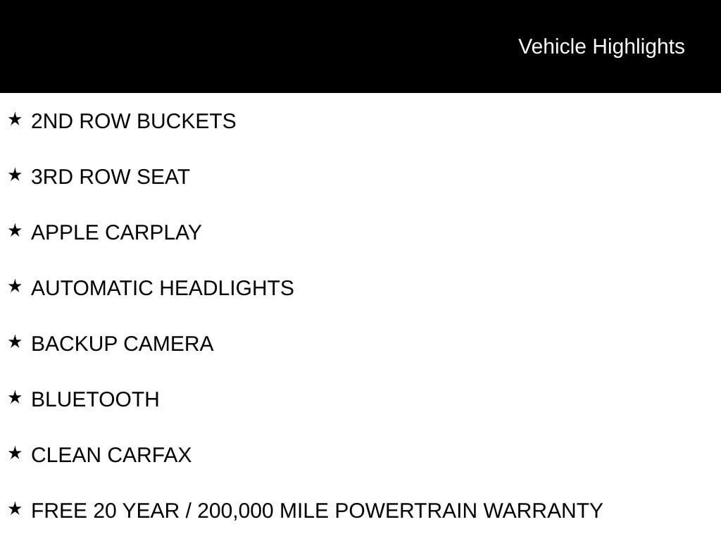 FREE 20 YEAR / 200,000 MILE POWERTRAIN WARRANTY, ONE OWNER, CLEAN CARFAX, BLUETOOTH, SIRIUS XM SATELLITE RADIO, APPLE CARPLAY, STEERING WHEEL AUDIO CONTROLS, TOUCH SCREEN CONTROLS, BACKUP CAMERA, KEYLESS PUSH BUTTON START, AUTOMATIC HEADLIGHTS, POWER DRIVER SEAT, HEATED FRONT LEATHER SEATS, 2ND ROW BUCKETS, 3RD ROW SEAT, MEMORY PACKAGE / MEMORY SEAT, REMOTE START, POWER LIFTGATE, HEATED STEERING WHEEL, TOURING L SERIES, QUICK ORDER PACKAGE 27L, 17 ALUMINUM WHEELS, 3.25 AXLE RATIO, 6 SPEAKERS, AIR CONDITIONING, AUTOMATIC TEMPERATURE CONTROL, BRAKE ASSIST, COMPASS, DELAY-OFF HEADLIGHTS, DRIVER VANITY MIRROR, DRIVER'S SEAT MOUNTED ARMREST, DUAL FRONT IMPACT AIRBAGS, DUAL FRONT SIDE IMPACT AIRBAGS, FOUR WHEEL INDEPENDENT SUSPENSION, FRONT DUAL ZONE A/C, FRONT FOG LIGHTS, HEATED DOOR MIRRORS, ILLUMINATED ENTRY, INTEGRATED CENTER STACK RADIO, LOW TIRE PRESSURE WARNING, OCCUPANT SENSING AIRBAG, OUTSIDE TEMPERATURE DISPLAY, OVERHEAD CONSOLE, PANIC ALARM, PARKVIEW REAR BACK-UP CAMERA, PASSENGER SEAT MOUNTED ARMREST, PASSENGER VANITY MIRROR, POWER DOOR MIRRORS, POWER WINDOWS, RADIO DATA SYSTEM, RAIN SENSING WIPERS, REAR AIR CONDITIONING, REAR WINDOW DEFROSTER, REAR WINDOW WIPER, RECLINING 3RD ROW SEAT, REMOTE KEYLESS ENTRY, SPEED CONTROL, SPOILER, TELESCOPING STEERING WHEEL, TILT STEERING WHEEL, TOURING SUSPENSION, TURN SIGNAL INDICATOR MIRRORS.