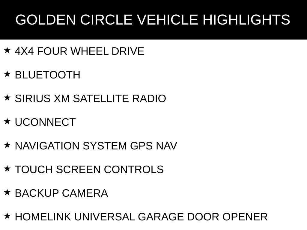 4X4 FOUR WHEEL DRIVE, BLUETOOTH, SIRIUS XM SATELLITE RADIO, UCONNECT, NAVIGATION SYSTEM GPS NAV, TOUCH SCREEN CONTROLS, BACKUP CAMERA, HOMELINK UNIVERSAL GARAGE DOOR OPENER, KEYLESS PUSH BUTTON START, AUTOMATIC HEADLIGHTS, POWER DRIVER SEAT, POWER PASSENGER SEAT, HEATED/COOLED LEATHER SEATS, HEATED REAR LEATHER SEATS, PANORAMIC SUNROOF/MOONROOF, MEMORY PACKAGE / MEMORY SEAT, TOW PACKAGE / TRAILER PACKAGE, HARMAN/KARDON HIGH END SOUND PACKAGE / 19 SPEAKERS, SUMMIT SERIES, QUICK ORDER PACKAGE 23R, 20" FULLY POLISHED ALUMINUM WHEELS, AIR CONDITIONING, ANTI-WHIPLASH FRONT HEAD RESTRAINTS, AUTO-DIMMING DOOR MIRRORS, AUTO-DIMMING REAR-VIEW MIRROR, AUTO-LEVELING SUSPENSION, AUTOMATIC TEMPERATURE CONTROL, BRAKE ASSIST, COMPASS, DRIVER VANITY MIRROR, EMERGENCY COMMUNICATION SYSTEM: UCONNECT ACCESS, ENGINE OIL COOLER, FRONT DUAL ZONE A/C, FRONT FOG LIGHTS, HEADLIGHT CLEANING, HEATED DOOR MIRRORS, LEATHER SHIFT KNOB, LEATHER STEERING WHEEL, LOW TIRE PRESSURE WARNING, NORMAL DUTY SUSPENSION, OCCUPANT SENSING AIRBAG, OUTSIDE TEMPERATURE DISPLAY, OVERHEAD CONSOLE, PANIC ALARM, PASSENGER VANITY MIRROR, POWER DOOR MIRRORS, POWER STEERING, POWER WINDOWS, RADIO DATA SYSTEM, RAIN SENSING WIPERS, REAR WINDOW DEFROSTER, REAR WINDOW WIPER, REMOTE KEYLESS ENTRY, SPEED-SENSITIVE WIPERS, TELESCOPING STEERING WHEEL, TILT STEERING WHEEL, TURN SIGNAL INDICATOR MIRRORS, VARIABLY INTERMITTENT WIPERS.