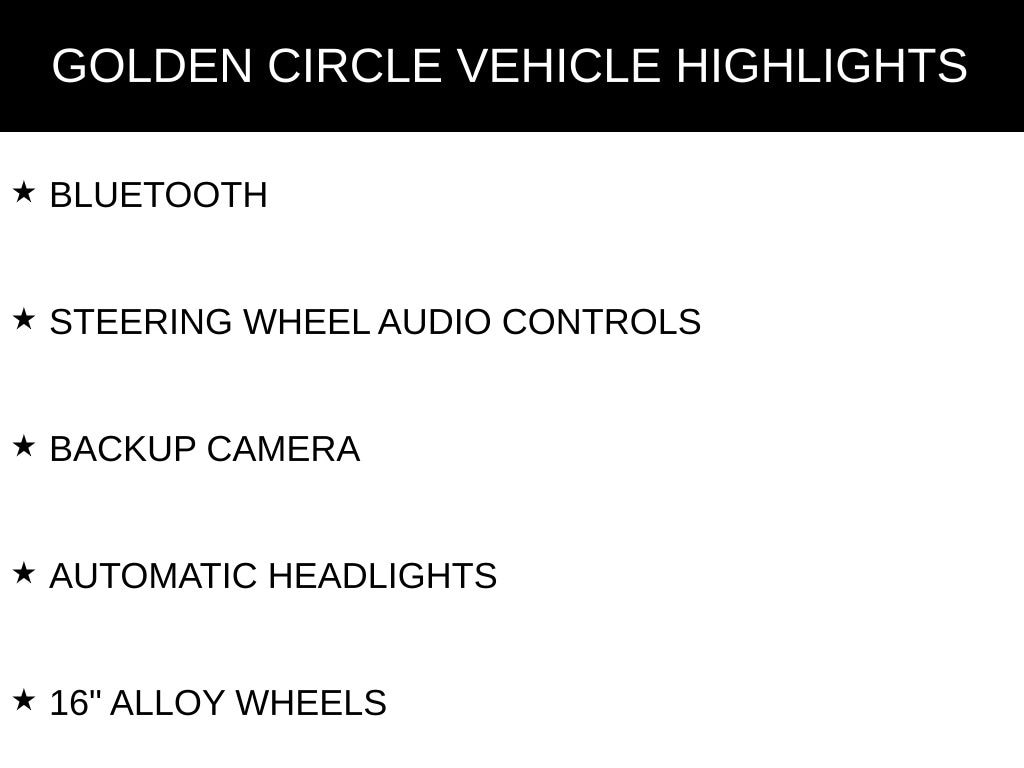 BLUETOOTH, STEERING WHEEL AUDIO CONTROLS, BACKUP CAMERA, AUTOMATIC HEADLIGHTS, 16" ALLOY WHEELS, 6 SPEAKERS, AIR CONDITIONING, BRAKE ASSIST, DRIVER VANITY MIRROR, DUAL FRONT IMPACT AIRBAGS, DUAL FRONT SIDE IMPACT AIRBAGS, FRONT WHEEL INDEPENDENT SUSPENSION, LOW TIRE PRESSURE WARNING, OCCUPANT SENSING AIRBAG, OUTSIDE TEMPERATURE DISPLAY, OVERHEAD CONSOLE, PANIC ALARM, PASSENGER VANITY MIRROR, POWER DOOR MIRRORS, POWER WINDOWS, REAR WINDOW DEFROSTER, REAR WINDOW WIPER, REMOTE KEYLESS ENTRY, SPEED CONTROL, SPEED-SENSING STEERING, TELESCOPING STEERING WHEEL, TILT STEERING WHEEL, VARIABLY INTERMITTENT WIPERS.